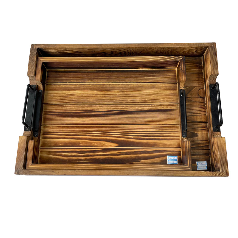 Disegni personalizzati accettati vassoio rustico rettangolare in legno con maniglie metalliche